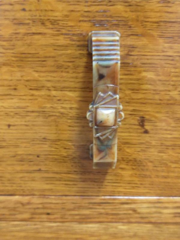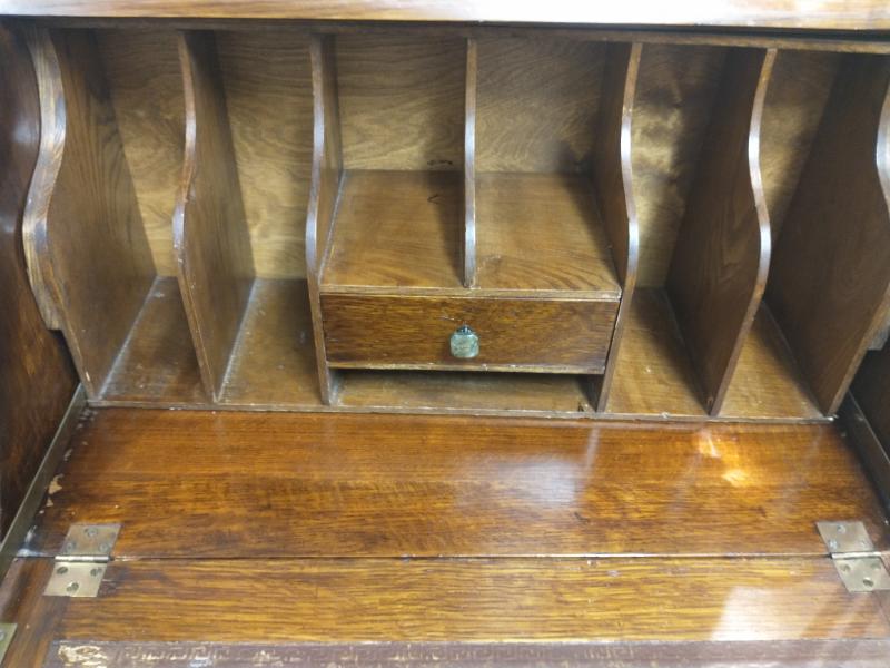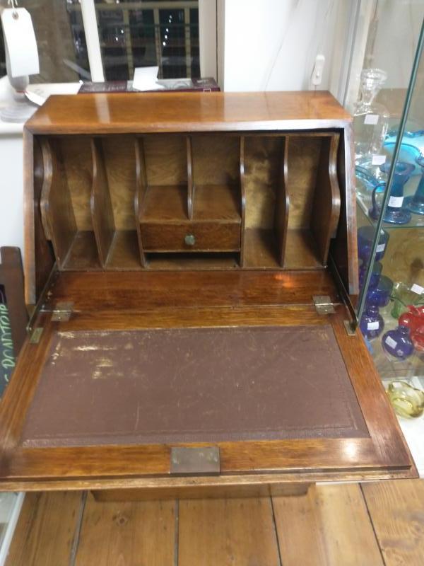 Lovely size vintage c 1930s/40s light Oak coloured wood writing bureau with 3 x chest of drawers with original plastic/bakelite? ornate handles. It's an usual writing bureau as when you pull down the front, the inside stationery section automatically moves forward. The props that hold the drop down door front come out automatically. Inside there is a brown leather insert which is a bit tatty but still useable to lean on write or to put your laptop/tablet on. There are some small pigeon holes and drawers which are great for storing your bits and bobs. All the drawers have dovetail joints which is always a sign of quality. It's in very good condition - inside has some minor marks inside as photographed but hardly a mark on the outside. A really good example of a vintage writing bureau with the novelty of the inside automatically moving when the front is pulled down. W: 24" (61cm); D: 16 1/2" (42cm); H: 38 1/2" (98cm); THIS ITEM CAN BE COLLECTED/VIEWED AT OUR SHOP IN THE PIECE HALL. CAN ALSO BE SENT OUT UK WIDE VIA COURIER (USUALLY £40-£60 WITH SOME REGIONAL EXCEPTIONS) & PLEASE CONTACT US FOR A QUOTE PRIOR TO PURCHASE. LOCAL DELIVERY CAN ALSO BE ARRANGED.